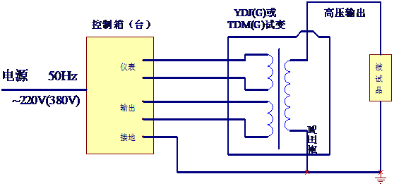 把電源輸入有過流自動脫扣及防止突發(fā)加壓的零位連鎖裝置的操作箱,經(jīng)自耦調(diào)壓器調(diào)節(jié)電壓輸入YDQ-J試驗(yàn)變壓器初級繞組,根據(jù)電磁感應(yīng)原理,在次級(高壓)繞組按其與初級繞組匝數(shù)之比可獲得同等倍數(shù)的電壓幅值-工頻高壓。