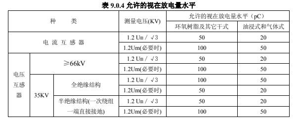 5.局部放電測(cè)量的測(cè)量電壓及視在放電量應(yīng)滿足表 9.0.4 中數(shù)據(jù)的規(guī)定。