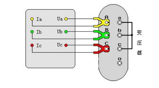 容量測試儀配有三把測試鉗(黃、綠、紅),每只鉗子分別引出兩根測試線,一根粗線、一根細線,粗線接到儀器面板上容量測試端子對應顏色的電流端子(Ia、Ib、Ic),細線接到儀器面板上容量測試端子對應顏色的電壓端子(Ua、Ub、Uc),將鉗頭按顏色分別夾在被試變壓器的高壓側各相接線柱上,變壓器的低壓側要用專用短接線良好短接。如圖所示: