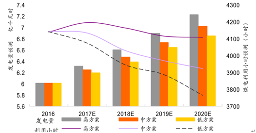按照我國(guó)第十三個(gè)五年計(jì)劃的規(guī)劃,到2020年,我國(guó)的煤電的發(fā)電總量將會(huì)是11億千瓦,其占全社會(huì)的總發(fā)電量將進(jìn)一步縮減4%左右,2017~2020發(fā)電量及發(fā)電小時(shí)預(yù)測(cè)如下圖: