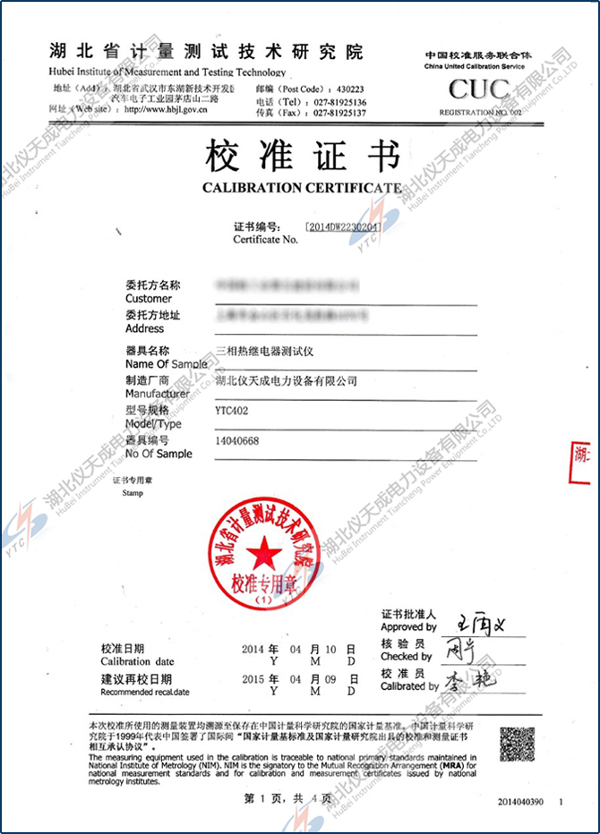轉(zhuǎn)載:"YTC402三相熱繼電器測試儀鑒定證書" 請(qǐng)注明來源于儀天成電力。 更多技術(shù)問題請(qǐng)致電儀天成電力客戶服務(wù):027-87876585,技術(shù)部專線:027-87876585,在線客服:719388481