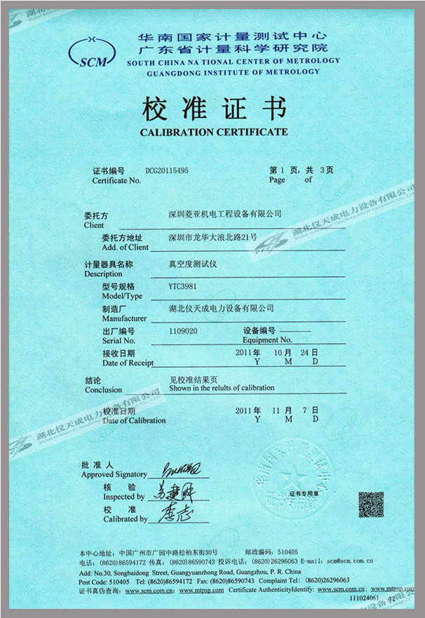 轉載:"YTC3981斷路器動特性分析儀鑒定證書" 請注明來源于儀天成電力。 更多技術問題請致電儀天成電力客戶服務:027-87876585,技術部專線:027-87876585,在線客服:719388481